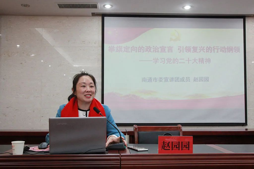 近日,深入推進(jìn)學(xué)習(xí)宣傳貫徹黨的二十大精神在鵬飛集團(tuán)蔚然成風(fēng),12月7日下午,南通市委宣講團(tuán)成員,南通市委黨校副校長(zhǎng)、教授趙園園走進(jìn)鵬飛,來公司開展學(xué)習(xí)貫徹黨的二十大精神專題宣講,進(jìn)一步引導(dǎo)鵬飛人把思想和行動(dòng)統(tǒng)一到黨的二十大精神上來。鵬飛集團(tuán)在新征程上用黨的創(chuàng)新理論武裝頭腦、指導(dǎo)實(shí)踐、推動(dòng)工作,更好地“扛起新使命、譜寫新篇章”,以實(shí)際行動(dòng)和過硬成果推動(dòng)黨的二十大精神落地見效。大公鎮(zhèn)黨委書記金山存、黨委副書記閻超、宣傳委員徐譯,鵬飛集團(tuán)黨委書記、董事長(zhǎng)王家安等認(rèn)真聽取了宣講內(nèi)容,經(jīng)發(fā)局全體人員、鵬飛集團(tuán)全體負(fù)責(zé)人、工人代表等參加專題學(xué)習(xí)。