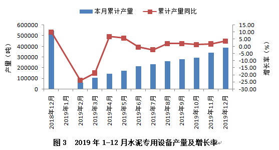 從行業(yè)重點(diǎn)監(jiān)測的產(chǎn)品看,水泥專用設(shè)備產(chǎn)量實(shí)現(xiàn)小幅增長,2019年累計(jì)完成38.65萬噸,同比增長3.69%,較上年同期下降6.37個百分點(diǎn)。從全年產(chǎn)量增速變化趨勢看(見圖3),上半年波動較大,下半年逐步趨緩、趨穩(wěn)。