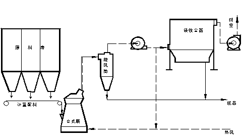 2.氣體流程:熱風→立式磨→旋風收塵器→1號排風機→袋收塵器→2號排風機→排空。 循環(huán)風(余熱利用)
