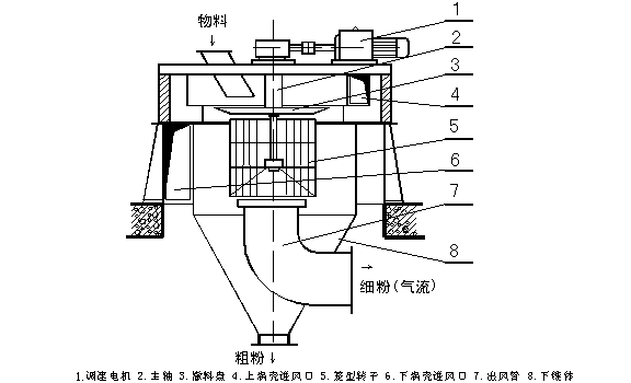 粉磨后的礦渣,由上部物料入口喂入選粉機,經(jīng)下料溜管落到撒料盤上;傳動裝置驅動主軸回轉,固定在主軸上的撒料盤和籠型轉子隨之旋轉,撒料盤上的礦渣粉被加速均勻地撒開;與此同時,上渦殼進入的氣流,在導向葉片的作用下,旋轉吹向撒料盤,加速物料分散的力度,和下落料幕的均勻性;隨之也提高了選粉機對礦渣粉的處理能力;下落料幕在下渦殼進入旋轉氣流的作用下,減緩了下落速度,延長了懸浮分散的時間;在籠型轉子回轉產(chǎn)生的平面渦流的作用下,逐步分級,粗顆粒由于自重或被轉子擊落,沉降到下錐體內(nèi),從底部粗粉出口排出,返回磨機重新粉磨;細顆粒隨氣流通過籠型轉子邊緣,進入中心部位,被出風管的負壓抽力帶入細粉收集系統(tǒng)過濾、分離、而收集下來。