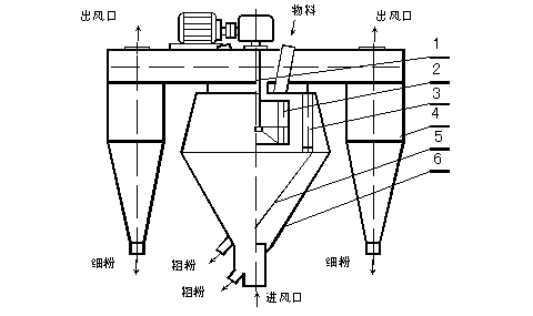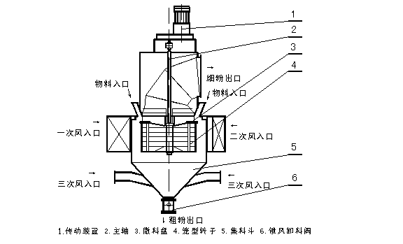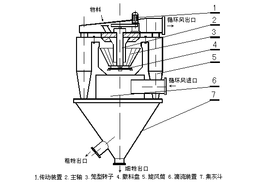 由傳動裝置、回轉部分(主軸、撒料盤、轉子等),機殼(內(nèi)筒、導向葉片、內(nèi)錐體、外筒、外錐體、進風口、加料口、兩個粗粉出口等),細粉收集裝置(四個旋風筒等)組成。
