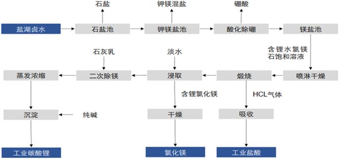 (五)煅燒法 煅燒浸取法的部分主要流程與大部分礦石的冶煉方法類(lèi)似,先將鹵水脫硼,蒸發(fā)濃縮得到水氯鎂石和氯化鋰的固體混合物,再進(jìn)行高溫煅燒(450-900℃)、水浸分離氧化鎂、純堿沉淀分離獲得碳酸鋰。