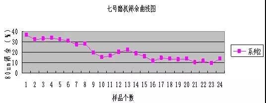 鑒于六七號磨機的狀況,我們對兩臺磨機停磨進磨觀察,六號磨機內兩倉料球比過高,進磨后看不到鋼球,物料高出一個鋼球的高度,正常情況下鋼球應該高出料面露出半個鋼球為最佳,隨現場測量計算六號磨一倉填充率為28.7%二倉為29.0%;七號磨機進磨觀察一倉鋼球露出料面一半,說明填充率應該是可以的,測量計算一倉的填充率為31.2%二倉為29.2%;這種磨機的最佳填充率一倉為30%左右二倉為31%左右。隨取七號磨樣做了磨機的篩余曲線,磨機均采用急停的停磨方式,入磨共取樣品24個做80um和200um的篩余。見圖1。