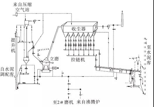 生產(chǎn)P·O42.5水泥時(shí)工藝流程是:熟料、石膏、石灰石、粉煤灰、礦渣等物料經(jīng)輸送設(shè)備輸送至各配料倉(cāng),粉煤灰從粉煤灰?guī)煜陆?jīng)輸送設(shè)備進(jìn)入生產(chǎn)系統(tǒng)。各種物料按一定比例設(shè)定,分別經(jīng)各定量給料機(jī)和輸送設(shè)備送至入磨鎖風(fēng)閥后入磨。入磨物料在磨內(nèi)進(jìn)行烘干和粉磨,粉磨后的物料經(jīng)選粉機(jī)分離,粗粉返回磨盤重新粉磨,合格細(xì)粉隨氣流直接進(jìn)入袋式收塵器進(jìn)行收集,收集下來(lái)的成品經(jīng)空氣斜槽、斗式提升機(jī)等輸送設(shè)備入水泥庫(kù)儲(chǔ)存;立磨吐渣經(jīng)輸送設(shè)備(設(shè)有除鐵器)進(jìn)入循環(huán)斗式提升機(jī),提升入磨后繼續(xù)粉磨。沸騰爐提供的熱風(fēng)與循環(huán)風(fēng)、冷風(fēng)混合后進(jìn)入磨內(nèi),磨內(nèi)混合風(fēng)起到烘干和提升物料的作用,出磨氣流進(jìn)入布袋收塵器;出布袋收塵器的氣體經(jīng)循環(huán)風(fēng)機(jī)后一部分經(jīng)循環(huán)風(fēng)管,作為循環(huán)風(fēng)入磨,其余氣體經(jīng)煙囪排入大氣。系統(tǒng)工藝流程見圖1。