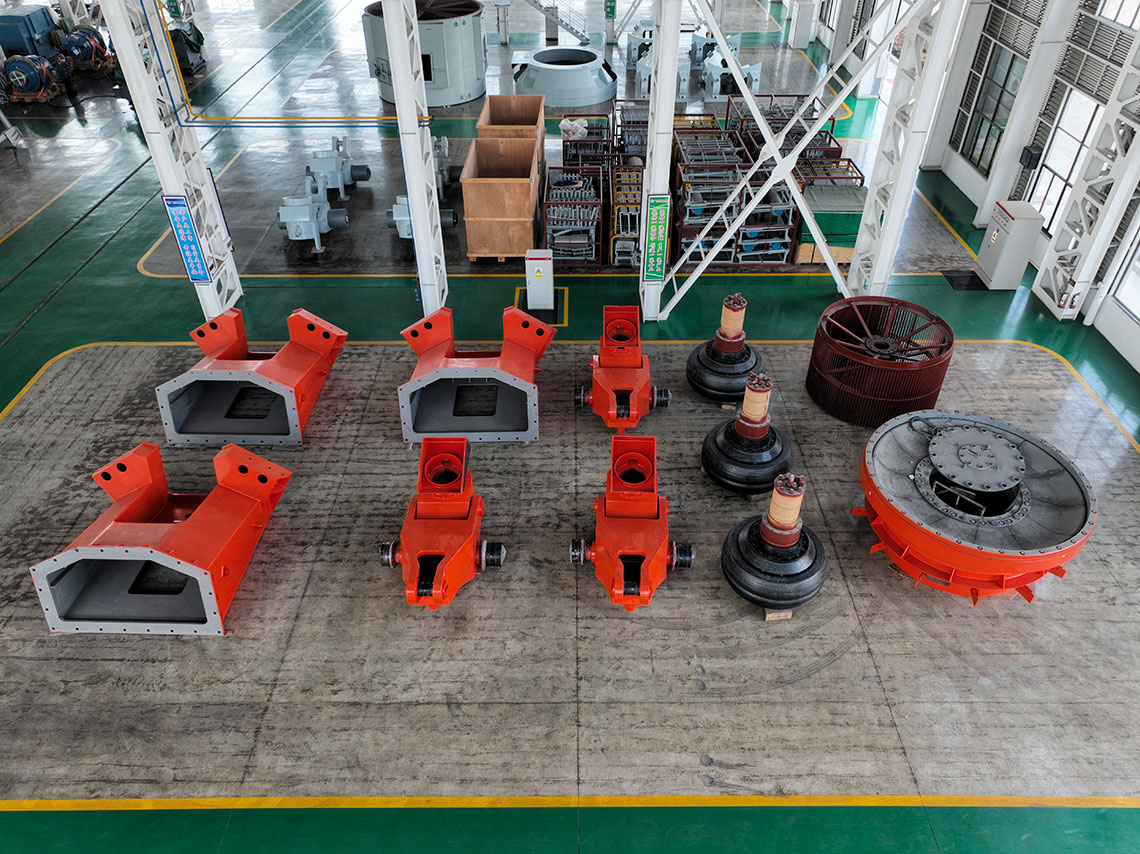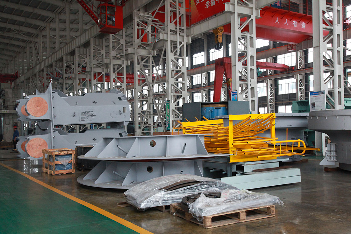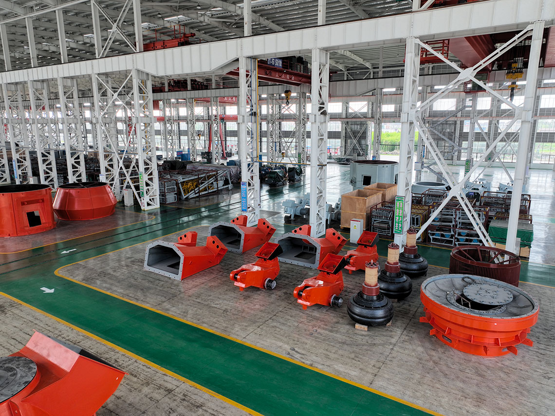磨煤機三個磨輥由旋轉(zhuǎn)的磨盤帶動進行碾磨作業(yè)。入磨物料經(jīng)中心落煤管落在磨盤上后,由旋轉(zhuǎn)磨盤產(chǎn)生的離心力將其輸送至碾磨輥道上碾磨。碾磨壓力由彈簧或液壓加壓裝置產(chǎn)生,通過靜定的三點系統(tǒng),碾磨力均勻地傳至三個磨輥,通過加壓系統(tǒng)壓力傳至基礎(chǔ)。煤粉的干燥和輸送利用熱風來進行。熱風通過噴嘴環(huán)均勻分布于磨盤四周,將經(jīng)碾磨的物料干燥并輸送至磨機上部的分離器。物料的粗細粉在此分離,細粉排出磨機,粗粉重新返回磨內(nèi)碾磨。物料中的一些不可破碎物可通過磨機下部的排碴口排出。磨煤機主要由基礎(chǔ)部,減速機,下架機,中架機,磨盤,磨輥,加壓裝置,分離器,正壓風密封裝置,蒸汽吹掃裝置等部件組成,還配有主電動機,潤滑油站,液壓站和密封風機等附屬設(shè)備,另備有慢速傳動裝置,安裝檢修專用工具,扶梯平臺,煤粉分配器,速斷閥等配套設(shè)備供用戶選用。磨煤機采用液壓加壓系統(tǒng),在運行中即可對粉磨壓力進行調(diào)整,并具有更好的過鐵保護性能。在原標準型的基礎(chǔ)上增加了磨輥翻出裝置,并提高了磨體的抗爆能力。