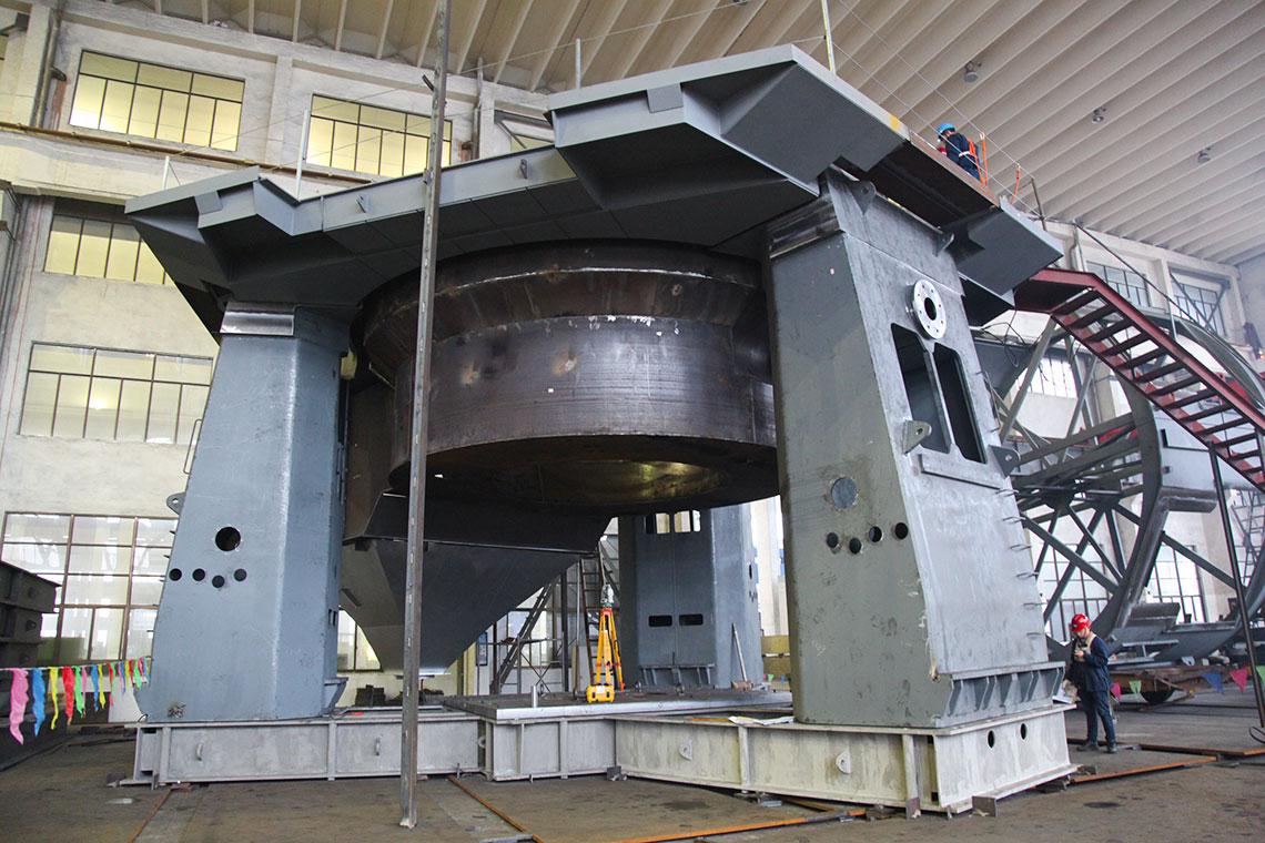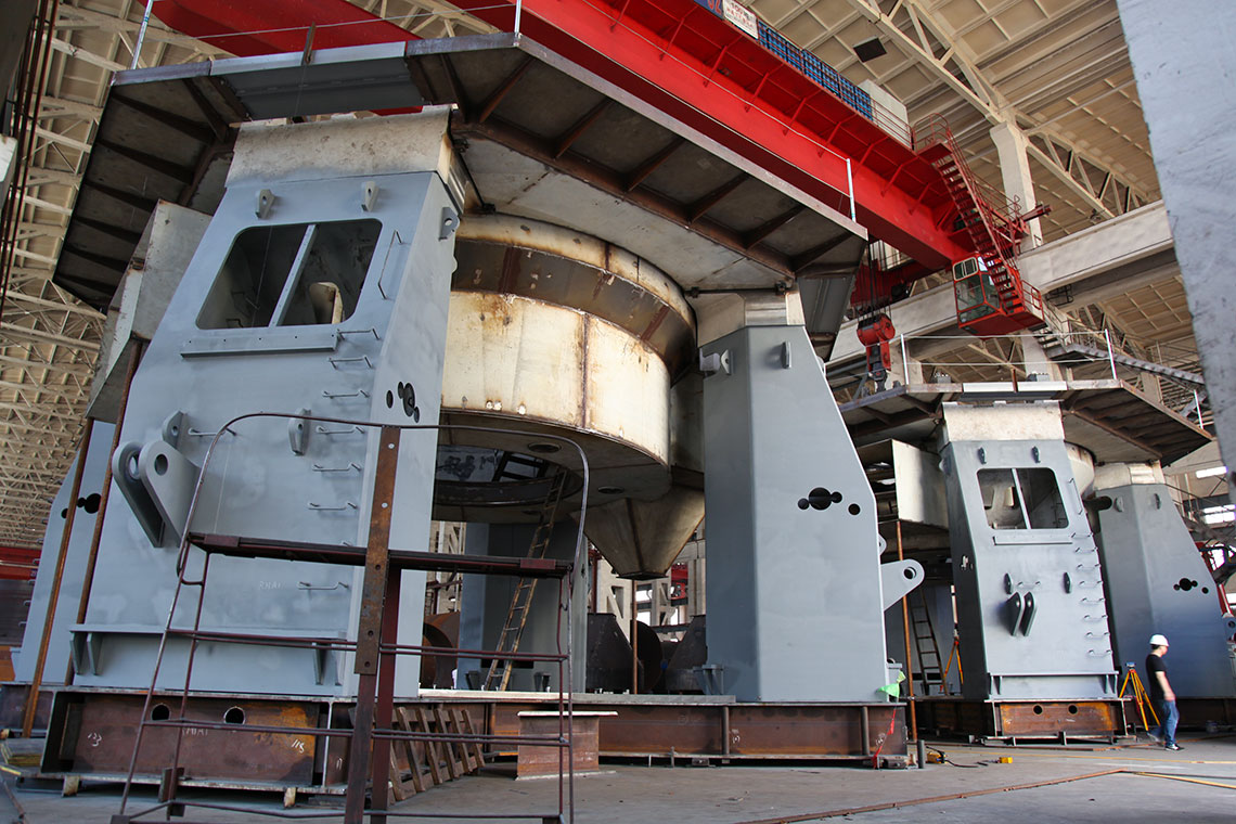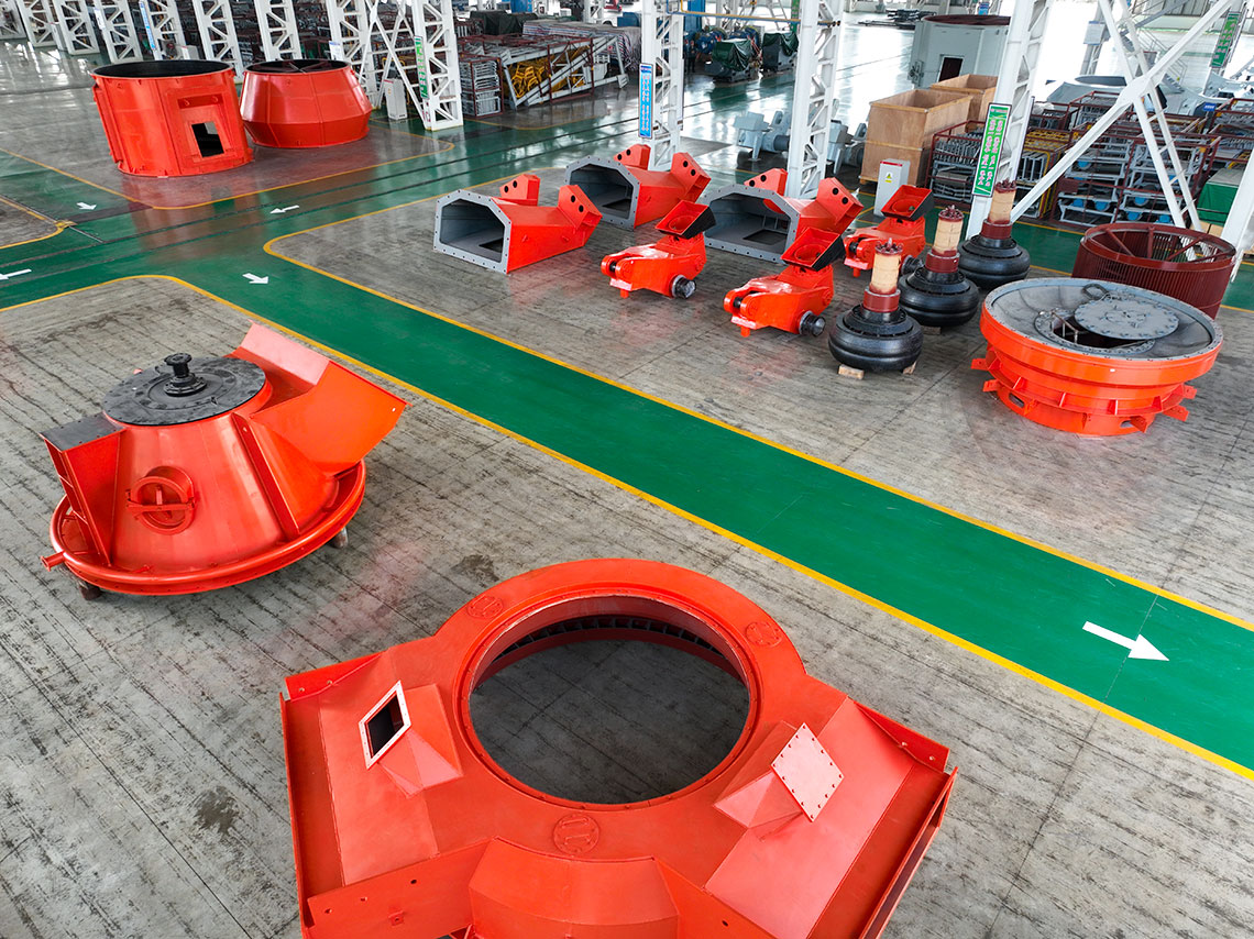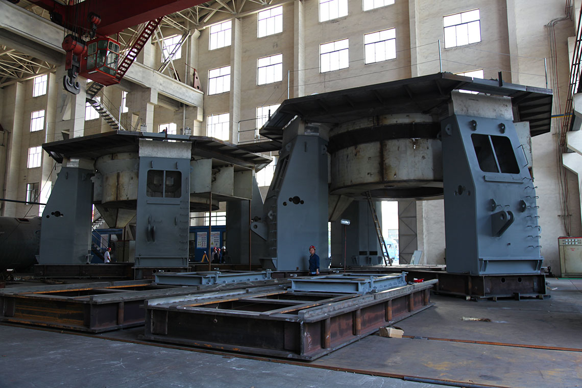 磨煤機三個磨輥由旋轉(zhuǎn)的磨盤帶動進行碾磨作業(yè)。入磨物料經(jīng)中心落煤管落在磨盤上后,由旋轉(zhuǎn)磨盤產(chǎn)生的離心力將其輸送至碾磨輥道上碾磨。碾磨壓力由彈簧或液壓加壓裝置產(chǎn)生,通過靜定的三點系統(tǒng),碾磨力均勻地傳至三個磨輥,通過加壓系統(tǒng)壓力傳至基礎(chǔ)。煤粉的干燥和輸送利用熱風來進行。熱風通過噴嘴環(huán)均勻分布于磨盤四周,將經(jīng)碾磨的物料干燥并輸送至磨機上部的分離器。物料的粗細粉在此分離,細粉排出磨機,粗粉重新返回磨內(nèi)碾磨。物料中的一些不可破碎物可通過磨機下部的排碴口排出。磨煤機主要由基礎(chǔ)部,減速機,下架機,中架機,磨盤,磨輥,加壓裝置,分離器,正壓風密封裝置,蒸汽吹掃裝置等部件組成,還配有主電動機,潤滑油站,液壓站和密封風機等附屬設(shè)備,另備有慢速傳動裝置,安裝檢修專用工具,扶梯平臺,煤粉分配器,速斷閥等配套設(shè)備供用戶選用。磨煤機采用液壓加壓系統(tǒng),在運行中即可對粉磨壓力進行調(diào)整,并具有更好的過鐵保護性能。在原標準型的基礎(chǔ)上增加了磨輥翻出裝置,并提高了磨體的抗爆能力。